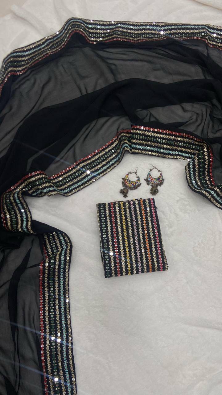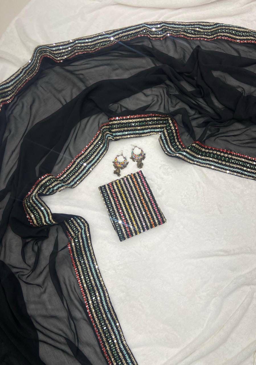 A perfect blend of elegance and comfort, this georgette saree is enhanced with delicate lace borders and complemented by a multicolour embroidered blouse with sequence detailing – ideal for special occasions and evening gatherings.