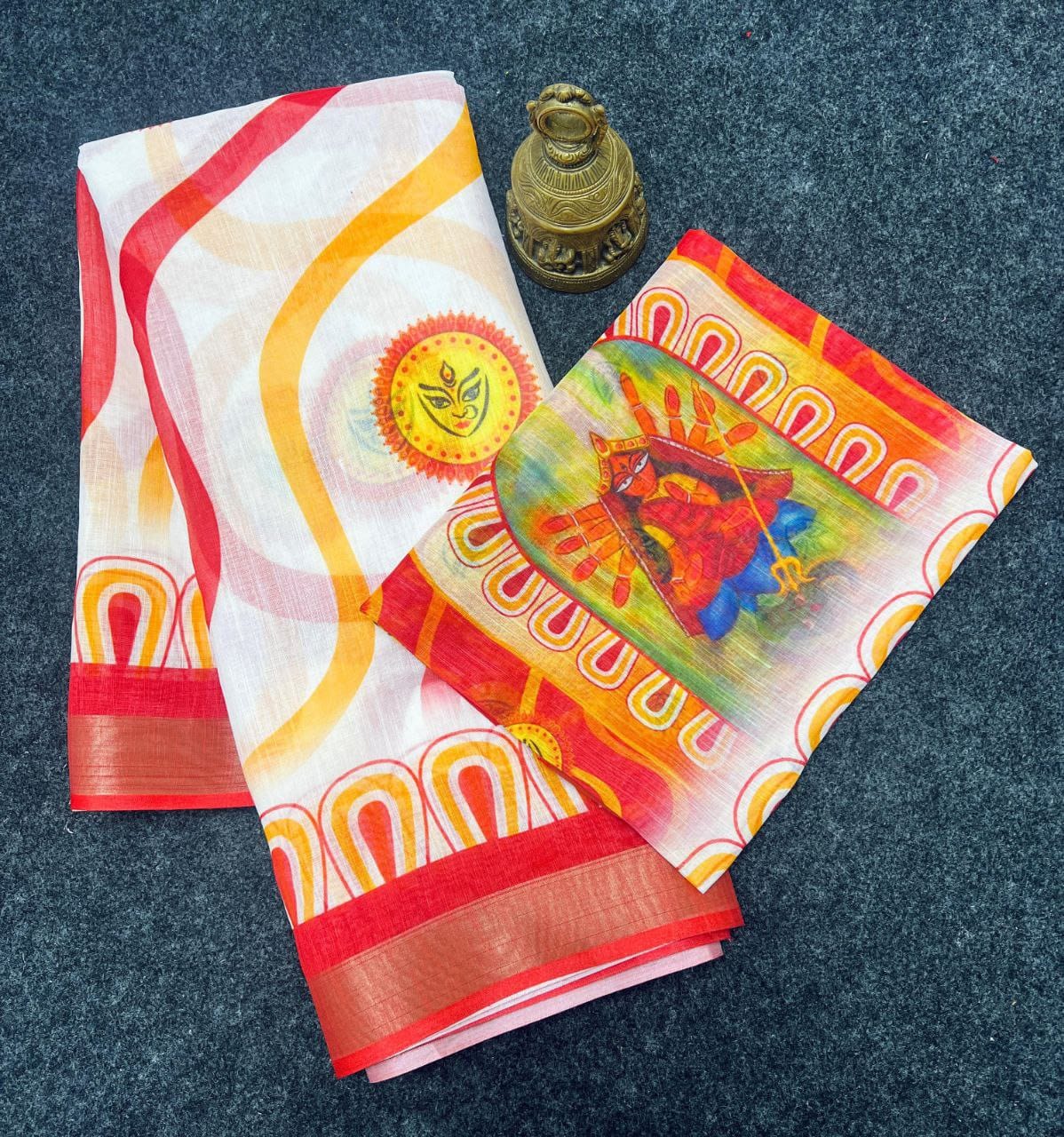 Step into elegance with the Devika Saree from the Mangalya Collection (MG468) — made from premium plain linen and adorned with digital print and golden jari border. A versatile pick for festive functions, daily wear, and graceful gifting.