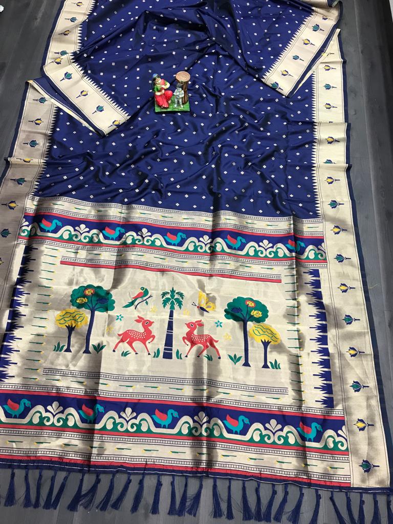 - Design: Full golden zari weaving butti and elegant border