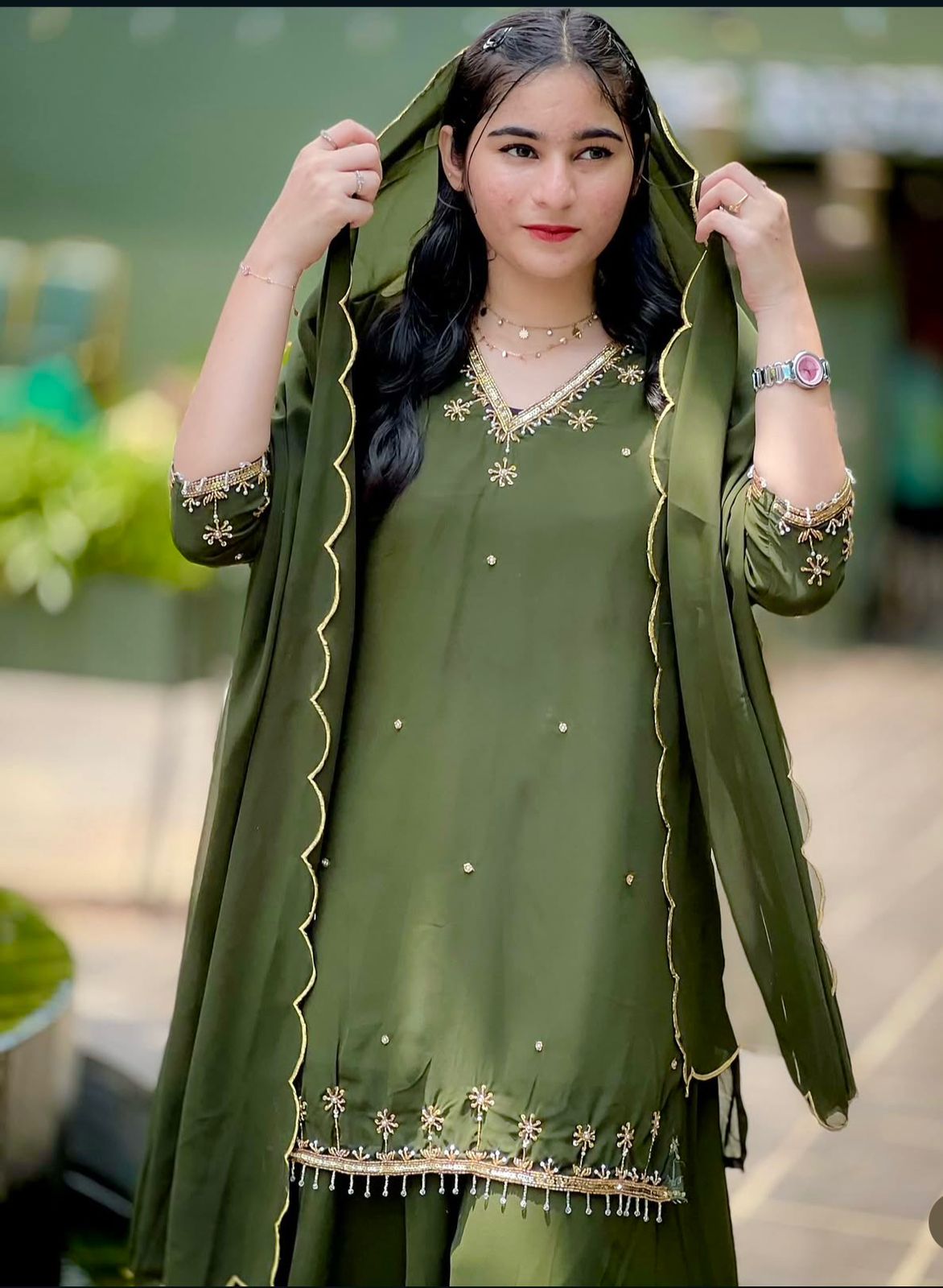 WW-1204 – Fox Georgette Top-Sarara-Dupatta Set - Green