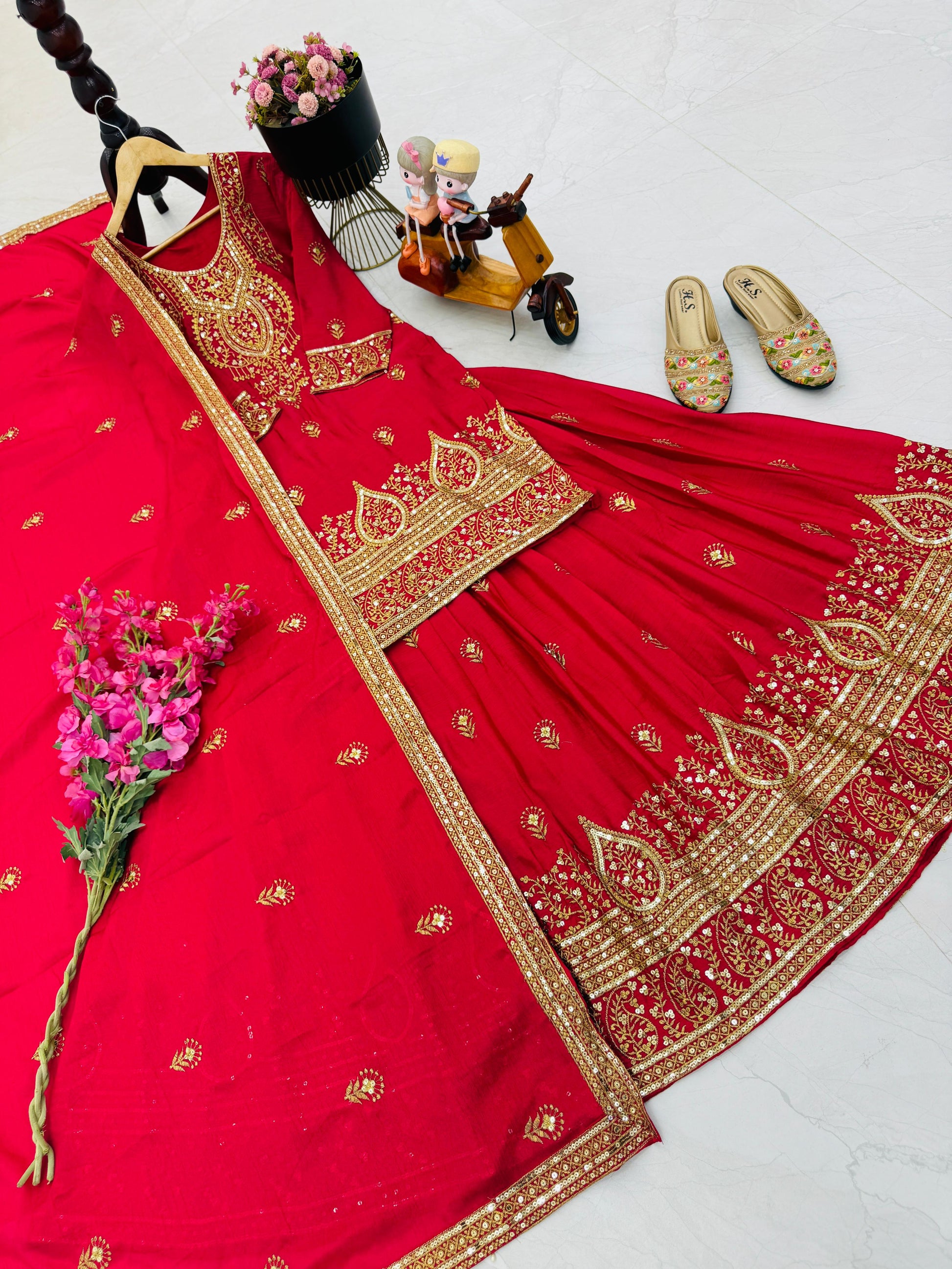 ZD-10005 – Designer Chinon Silk Lehenga Suit Set - Red