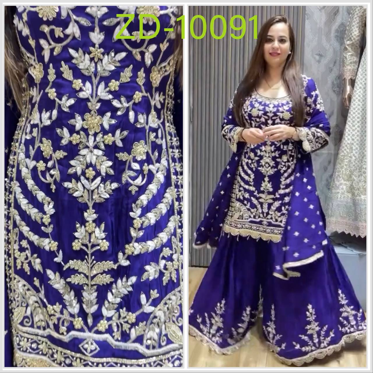ZD-10091 – Embroidered Chinon Silk Top-Sharara-Dupatta Set - BLUE